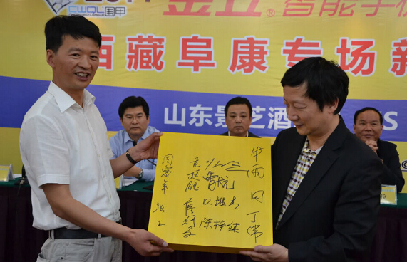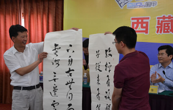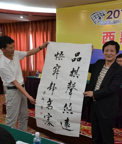 發(fā)布會(huì)最后曹大元九段代表兩隊(duì)棋手像王斌贈(zèng)送國(guó)手簽名的棋盤(pán),王斌則用三幅字回贈(zèng)兩隊(duì)。