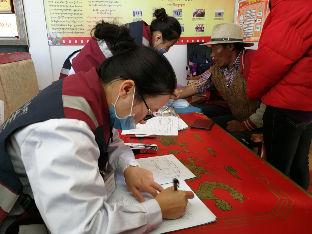 前來檢查的群眾有很多,配合我們工作的還有三位當(dāng)?shù)匦l(wèi)生院的小姑娘,她們主要負(fù)責(zé)登記和信息錄入,由于檢查群眾太多,她們的桌子被圍得水泄不通,但她們始終面帶微笑,一絲不茍地小心翼翼登記,生怕工作出現(xiàn)紕漏。