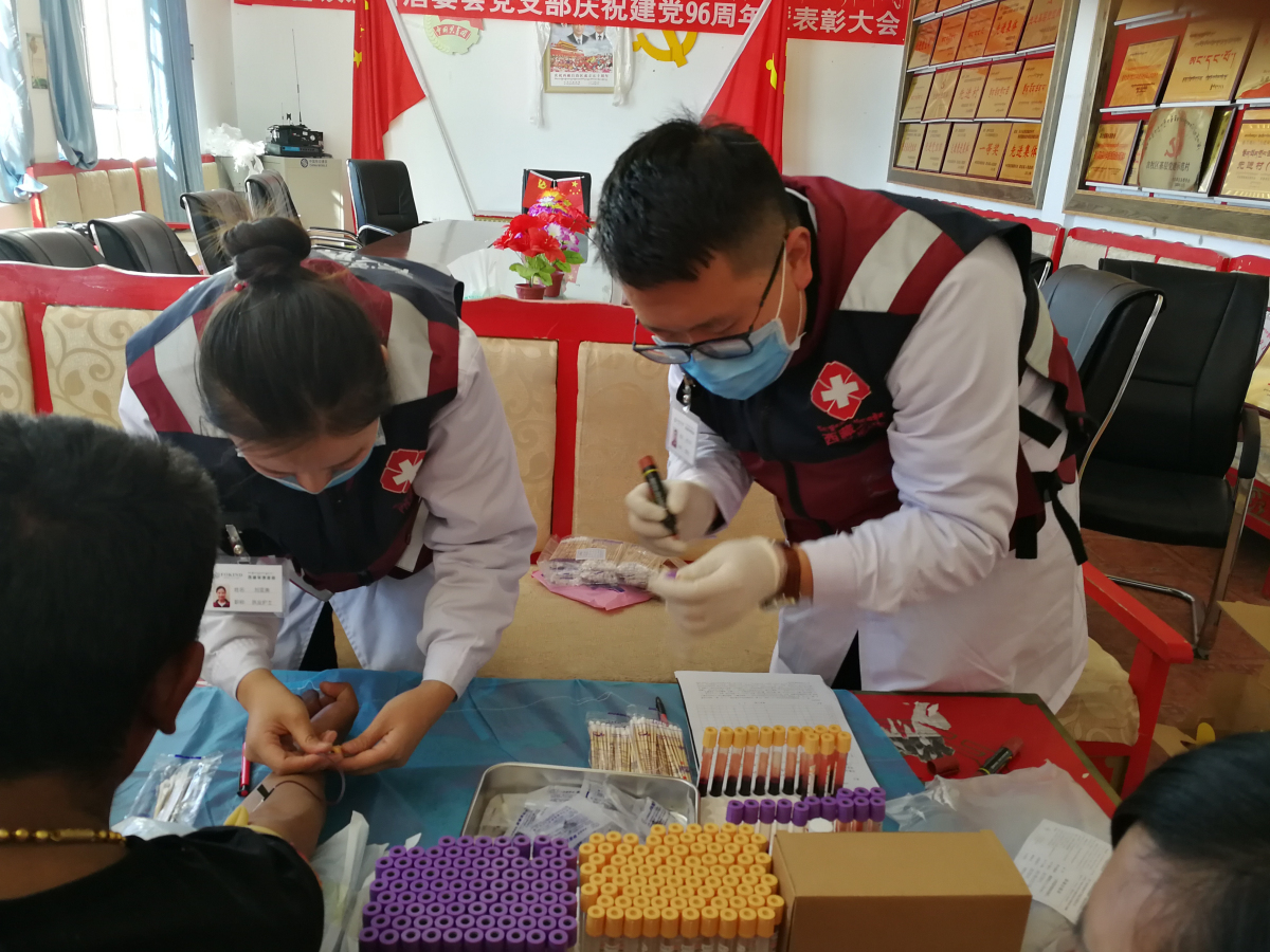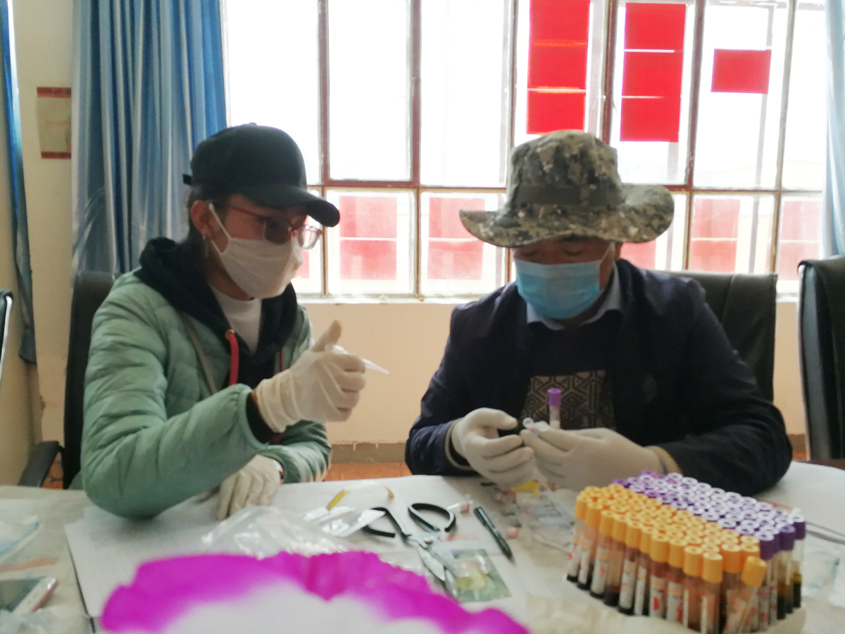 鐘義華、劉亞美、丁雪琴分到另一組,負(fù)責(zé)采血和血樣信息錄入工作。鐘義華是檢驗士也是隊長,更是我們醫(yī)療隊唯一的男孩子,重活、粗活全包,還要負(fù)責(zé)隊員的工作安排,以及與政府領(lǐng)導(dǎo)、工作人員的溝通協(xié)調(diào),除此之外,他還要負(fù)責(zé)血樣采集、包蟲病防治的宣傳。