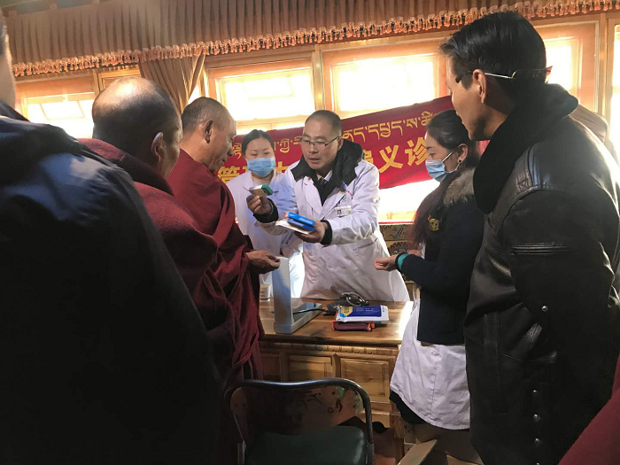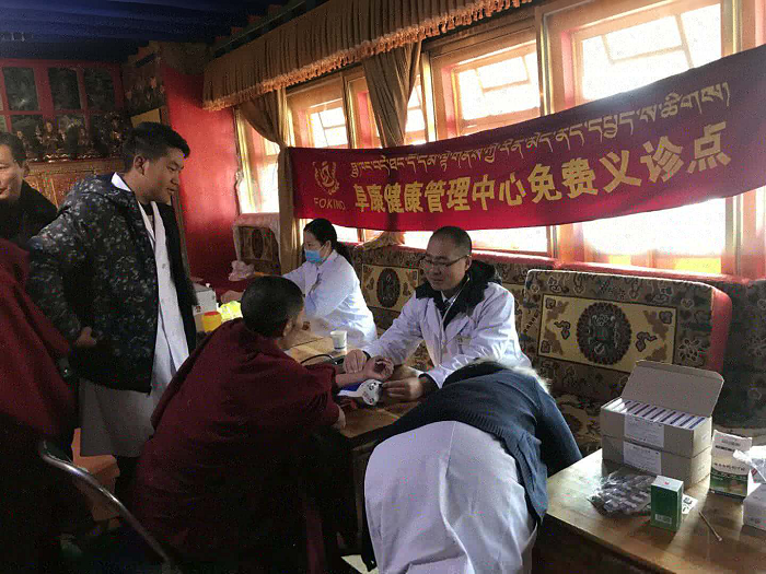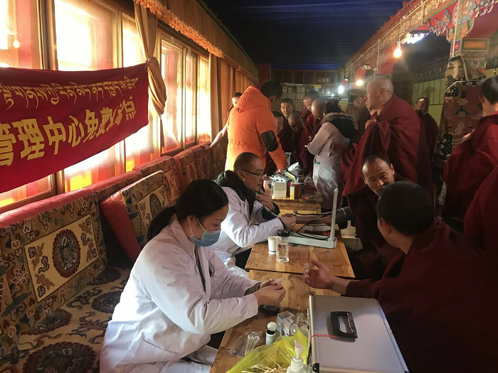 11月28日上午,西藏阜康醫(yī)院慢病管理中心義診分隊(duì)來到甘丹寺管理委員會(huì)。在文物資產(chǎn)處處長羅布次仁的接待下,我院5名醫(yī)務(wù)人員走進(jìn)了甘丹寺,義診分隊(duì)此行帶著阜康人送醫(yī)送藥的暖心活動(dòng)、帶著“用知識(shí)和良知為人類健康服務(wù)”的宗旨、帶著阜康醫(yī)院幾千元的藥品,為全寺430名僧侶免費(fèi)測血壓、血糖、氧飽和度以及發(fā)放常見疾病的藥物。