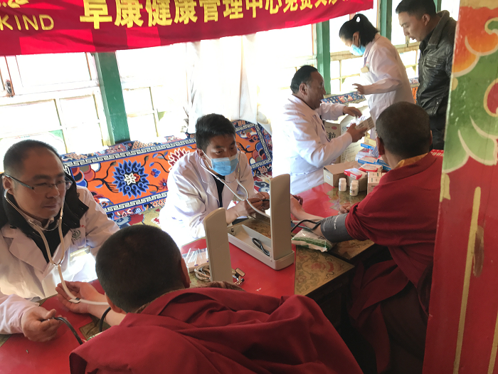 隨后,義診活動井然有序地開始了,張院長和田豐輝醫(yī)生負(fù)責(zé)測血壓,護(hù)士唐宗青測血糖,瓊瑪負(fù)責(zé)發(fā)放藥品,占堆(我院體檢中心醫(yī)務(wù)人員)對每一位血壓、血糖高的僧人、群眾進(jìn)行登記,有利于以后對他們的健康進(jìn)行隨訪跟蹤,了解他們有無不適以及血壓、血糖情況,督促他們的按時服藥、并指導(dǎo)他們健康的生活方式。在義診體檢過程中,一名76歲的老人,血壓200/120mmHg,經(jīng)過詢問,老人身體并沒有不適,在詳細(xì)的給老人講解了高血壓對身體健康的影響,以及高血壓帶來的危害后,并給予老人免費(fèi)發(fā)了治療高血壓的藥物,囑咐他這幾天要每天規(guī)律服用降壓藥物、監(jiān)測血壓,直至血壓在正常范圍后可以改為三到五天測一次血壓,但降血壓藥物不能停止,老人欣然接受意見,并握手致謝。