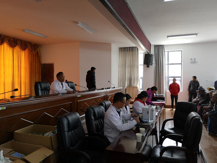 隨后,阜康義診隊對前來咨詢和檢查的牧民做了詳細(xì)的解答和初步的身體檢查。周健主治醫(yī)師負(fù)責(zé)測量血壓、了解老百姓的基本健康情況,唐宗青護(hù)士負(fù)責(zé)給牧民測血糖,瓊瑪副主任醫(yī)師和榮瑪鄉(xiāng)高海拔生態(tài)搬遷點醫(yī)務(wù)室的同志負(fù)責(zé)給老百姓發(fā)放藥品,工作在有條不紊中進(jìn)行。