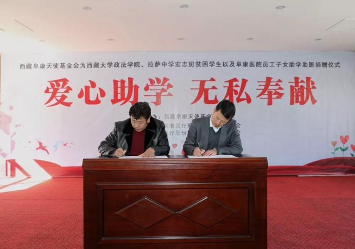 西藏阜康天使基金會(huì)理事長(zhǎng)、西藏阜康醫(yī)療股份有限公司黨委書記、董事長(zhǎng)王斌與拉薩中學(xué)校長(zhǎng)陳飛簽訂捐助協(xié)議