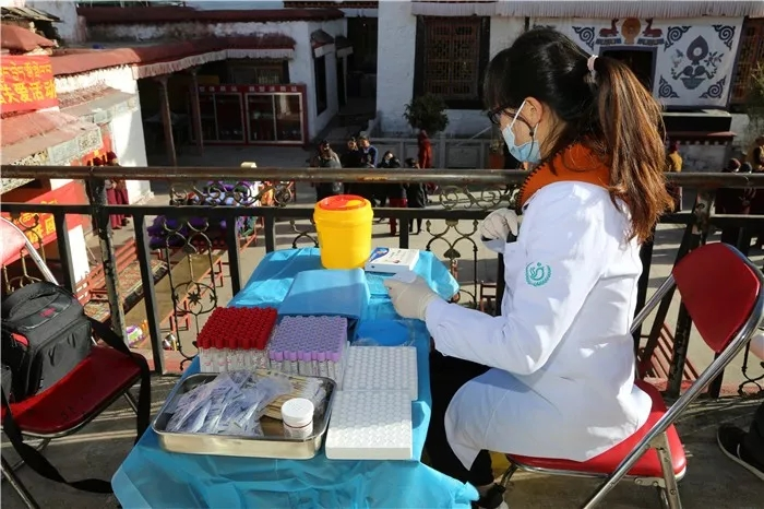 上午8點,朱主任一行人分別從阜康婦產(chǎn)兒童分院和阜康健康體檢中心兩路出發(fā),經(jīng)過一個多小時的路途顛簸,于9點15分到達雄色寺,尼眾和駐寺干部們早已等候在寺廟庭院內(nèi)。由于體檢項目中有血液檢查,不能進食,為了不讓尼眾和干部們?nèi)甜囂茫熘魅我恍腥说竭_雄色寺以后,快速整理現(xiàn)場,將所用儀器與藥品一一擺放整齊,在區(qū)婦聯(lián)領(lǐng)導(dǎo)講話以及受邀律師宣講完畢以后,立刻投入為各位尼眾與干部體檢的工作當中。