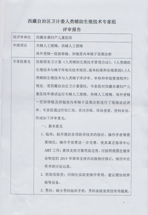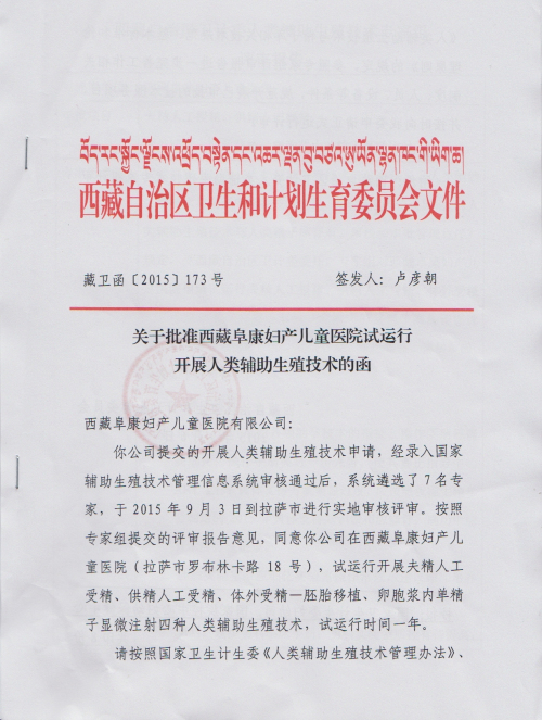 你公司提交的開(kāi)展人類(lèi)輔助生殖技術(shù)申請(qǐng),經(jīng)錄入國(guó)家輔助生殖技術(shù)管理信息審核通過(guò)后,系統(tǒng)遴選了7名專(zhuān)家,于2015年9月3日到拉薩市進(jìn)行實(shí)地審核評(píng)審。按照專(zhuān)家組提交的評(píng)審報(bào)告意見(jiàn),同意你公司在西藏阜康婦產(chǎn)兒童醫(yī)院(拉薩市羅布林卡路18號(hào)),試運(yùn)行開(kāi)展精子人工受精、供精人工受精、體外受精-胚胎移植、卵胞漿內(nèi)單精子顯微注射四種人類(lèi)輔助生殖技術(shù),試運(yùn)行時(shí)間一年。