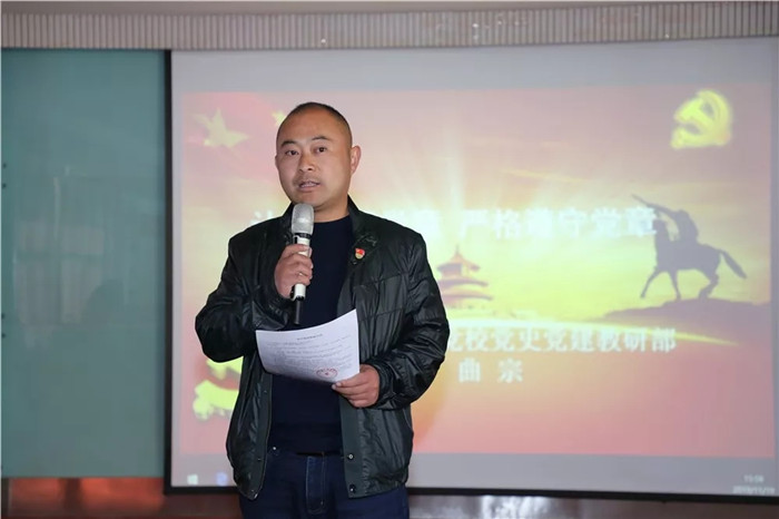 曲宗副教授首先明確了黨章 “根本大法”的地位,指出黨章是規(guī)范和指導黨的工作、黨內(nèi)活動、黨的建設的根本依據(jù)。隨后曲宗副教授介紹了黨章的歷史沿革,以及十九大修改黨章的歷史意義和重要內(nèi)容,號召每一名黨員認真學習黨章,嚴格遵守黨章,時刻與黨中央保持一致,自覺做到“兩個維護”。要求每一名黨員都把黨章作為政治思想建設方面的X光機,每年對照黨章給自己“體檢”一下,紅紅臉、出出汗,牢記入黨初心、遵守黨的紀律,維護一名黨員的思想行為純潔性。
