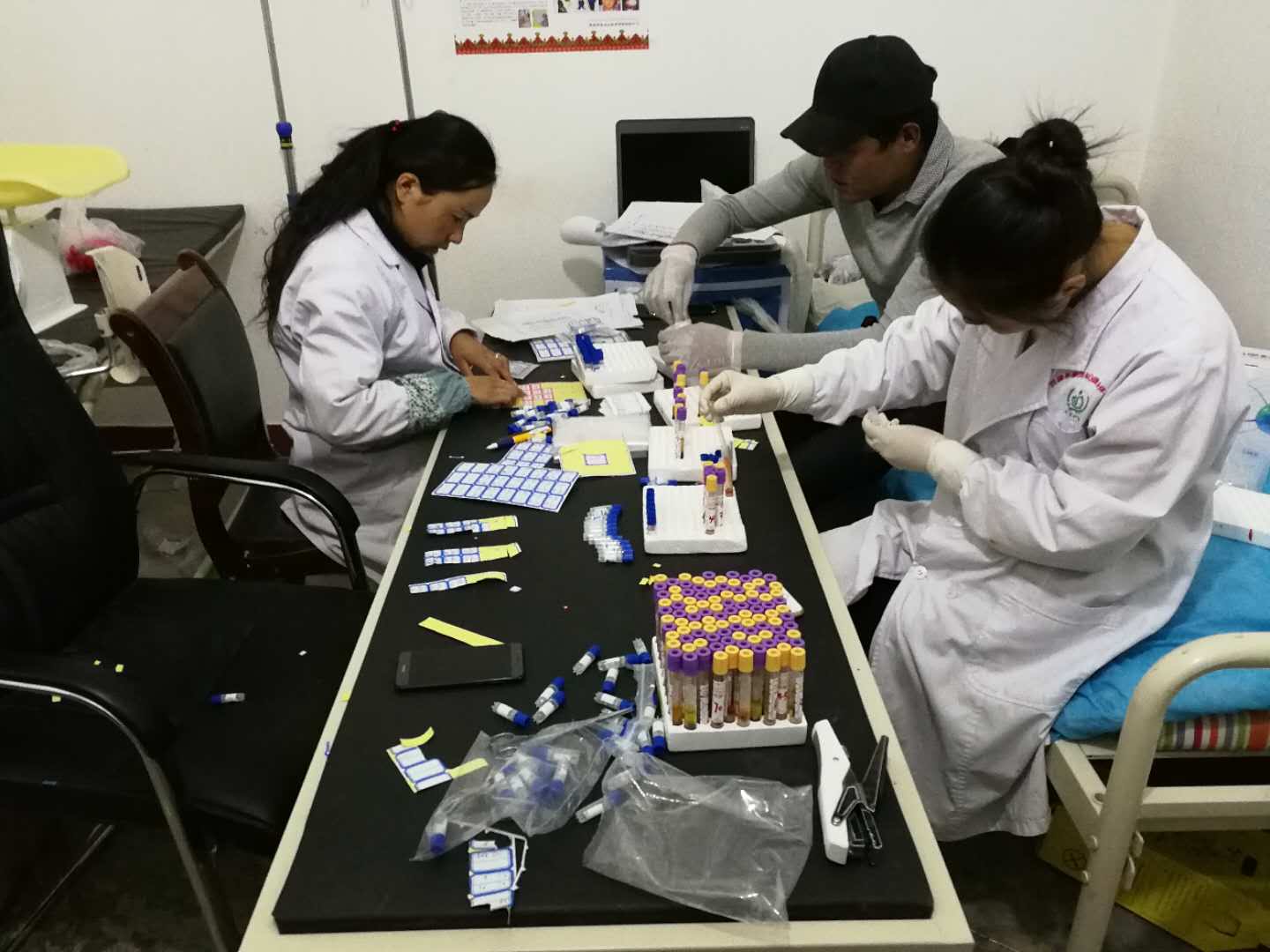 在篩查完夏瑪村牧業(yè)點后,醫(yī)療隊又迅速趕往鹽湖鄉(xiāng)。我們走進鹽湖鄉(xiāng)衛(wèi)生院,隨處都能看到包蟲病防治知識張貼畫和宣傳欄。15、16日,在鹽湖鄉(xiāng)衛(wèi)生院篩查的工作量很大,每天篩查結(jié)束后,還要對當(dāng)天的血液進行分離,醫(yī)療隊的隊員們一天工作下來已經(jīng)累得說不出話來,每天經(jīng)常是一早出門,工作到凌晨才回到住所。