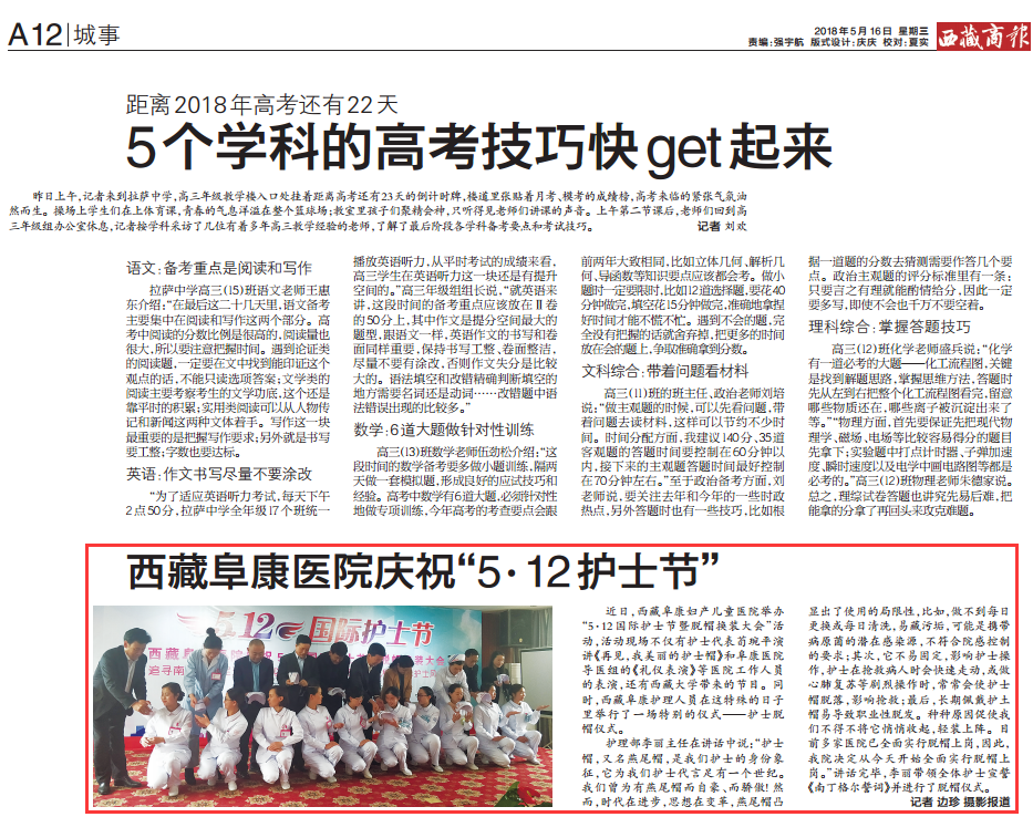 近日,西藏阜康婦產(chǎn)兒童醫(yī)院舉辦“5·12國際護士節(jié)暨脫帽換裝大會”活動,活動現(xiàn)場不僅有護士代表荀琬平演講《再見,我美麗的護士帽》和阜康醫(yī)院導醫(yī)組的《禮儀表演》等醫(yī)院工作人員的表演,還有西藏大學帶來的節(jié)目。同時,西藏阜康護理人員在這特殊的日子里舉行了一場特別的儀式——護士脫帽儀式。