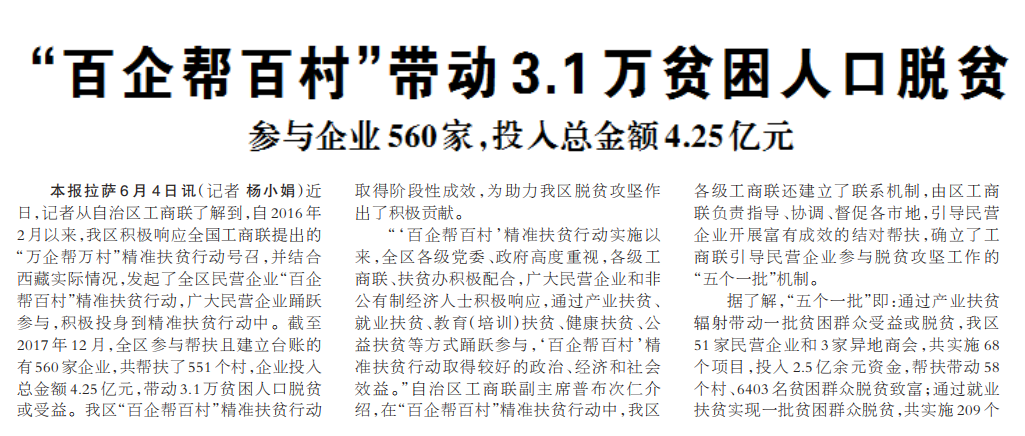 本報拉薩6月4日訊(記者 楊小娟)近日,記者從自治區(qū)工商聯(lián)了解到,自2016年2月以來,我區(qū)積極響應全國工商聯(lián)提出的“萬企幫萬村”精準扶貧行動號召,并結(jié)合西藏實際情況,發(fā)起了全區(qū)民營企業(yè)“百企幫百村”精準扶貧行動,廣大民營企業(yè)踴躍參與,積極投身到精準扶貧行動中。截至2017年12月,全區(qū)參與幫扶且建立臺賬的有560家企業(yè),共幫扶了551個村,企業(yè)投入總金額4.25億元,帶動3.1萬貧困人口脫貧或受益。我區(qū)“百企幫百村”精準扶貧行動取得階段性成效,為助力我區(qū)脫貧攻堅作出了積極貢獻。