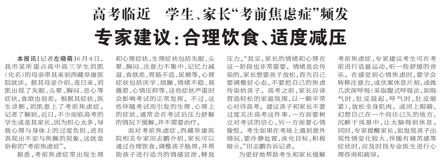 面對考前焦慮癥,西藏阜康醫(yī)院相關(guān)專家田志鵬介紹,家長可以通過合理飲食,調(diào)整孩子腸胃,并幫助孩子進行適當(dāng)?shù)那楦行梗尫艍毫Α?ldquo;其實,家長的情緒和心理在這一階段也非常重要。情緒是會傳染的,家長想要孩子放松,首先自己要調(diào)整好心態(tài),不要把自己的焦慮傳染給孩子。高考之前,家長應(yīng)該營造輕松的家庭氛圍,以一顆平常心對待高考。建議孩子和家長不要過度關(guān)注高考這件事,一方面要樹立對考試的信心,另一方面要心情愉悅。考生如果在考場上遇到意外情況,要冷靜處置,淡化目標,積極暗示。”田志鵬告訴記者。