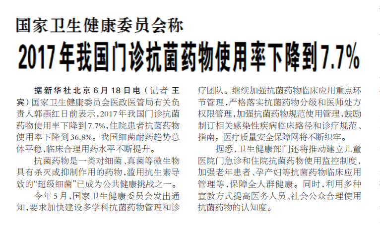 據(jù)新華社北京6月18日電 (記者 王賓) 國家衛(wèi)生健康委員會醫(yī)政醫(yī)管局有關(guān)負(fù)責(zé)人郭燕紅日前表示,2017年我國門診抗菌藥物使用率下降到7.7%,住院患者抗菌藥物使用率下降到36.8%。我國細(xì)菌耐藥趨勢總體平穩(wěn),臨床合理用藥水平不斷提升。