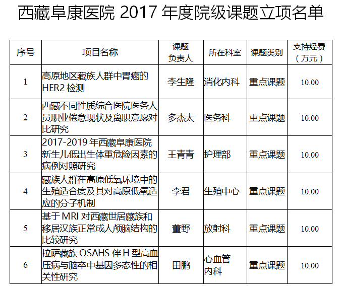 這是我院首次組織申報并批準(zhǔn)立項(xiàng)的院級課題。課題主持人均為我院醫(yī)務(wù)人員。本年度立項(xiàng)資助的6個課題均為院級重點(diǎn)課題,每項(xiàng)課題將提供10萬元的研究經(jīng)費(fèi)。課題自2017年10月1日正式實(shí)施,期限為兩年。