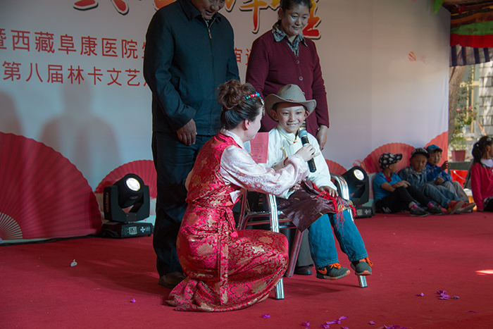 看藏裝典雅,賞舞姿婀娜。在三位主持人熱情洋溢的主持下,一曲優(yōu)雅典美的藏舞《芒康弦子》正式拉開(kāi)了本次林卡文藝匯演的帷幕,也再度點(diǎn)燃了大家的林卡情懷!隨后,由醫(yī)院各科室員工帶來(lái)的諸如藏語(yǔ)歌曲演唱、小提琴演奏、架子鼓演奏、吉他演奏、古箏演奏、軍禮表演、現(xiàn)代舞蹈、獨(dú)舞、歌唱、小品、相聲、T臺(tái)秀、大合唱等一系列精彩紛呈的節(jié)目應(yīng)接不暇地呈現(xiàn)在大家眼前,讓現(xiàn)場(chǎng)觀眾為之歡呼雀躍,好不開(kāi)懷。同時(shí),在本次的林卡文藝匯演中,還有一個(gè)十分特殊的節(jié)目——一個(gè)名為塔巴次仁的藏族小男孩及其家屬為我們?nèi)w阜康工作人員寫(xiě)來(lái)一封感謝信,并在林卡演出現(xiàn)場(chǎng)為大家演唱了一首《感恩的心》。