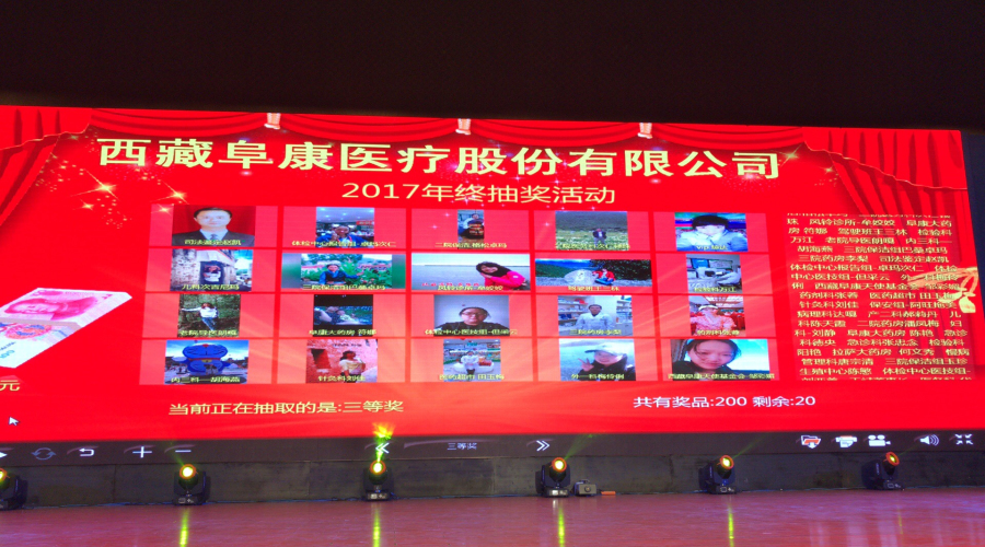 2018年1月10日,西藏阜康醫(yī)療股份有限公司新年團(tuán)拜會(huì)在拉薩洲際酒店舉行,下午四點(diǎn)來自西藏阜康醫(yī)院、婦產(chǎn)兒童分院、心腦血管分院、健康體檢中心,阜康大藥房、超市的員工陸續(xù)來到會(huì)場(chǎng)。下午五點(diǎn),主持人劉連福院長(zhǎng)宣布會(huì)議正式開始,場(chǎng)內(nèi)音樂響起,董事長(zhǎng)王斌帶領(lǐng)醫(yī)院領(lǐng)導(dǎo)和特邀嘉賓入場(chǎng),會(huì)場(chǎng)立刻響起雷鳴般的掌聲和歡呼聲。