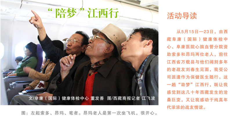 我們5月15日從拉薩出發(fā),一路向東,到成都轉(zhuǎn)機(jī),兩天的時(shí)間,已經(jīng)跨越了2400多公里。16日,載著夢(mèng)想的飛機(jī)抵達(dá)了江西南昌機(jī)場(chǎng),劉春生老人的大兒子在機(jī)場(chǎng)熱情地迎接我們,將我們接到老人的故鄉(xiāng)萬載縣。我們決定在縣城賓館休息一天后再啟程前往劉春生老人的家,于是我為同行的兩位老人做了全面的檢查,索多老人的血糖在7.0mmol/L左右,令我擔(dān)心的是昂瑪老人血壓本來就偏高而且又是第一次去內(nèi)地,他的血壓波動(dòng)在140-150/90-100mmHg,比較平穩(wěn),我叮囑老人見面時(shí)注意控制情緒,不要過于激動(dòng)。
