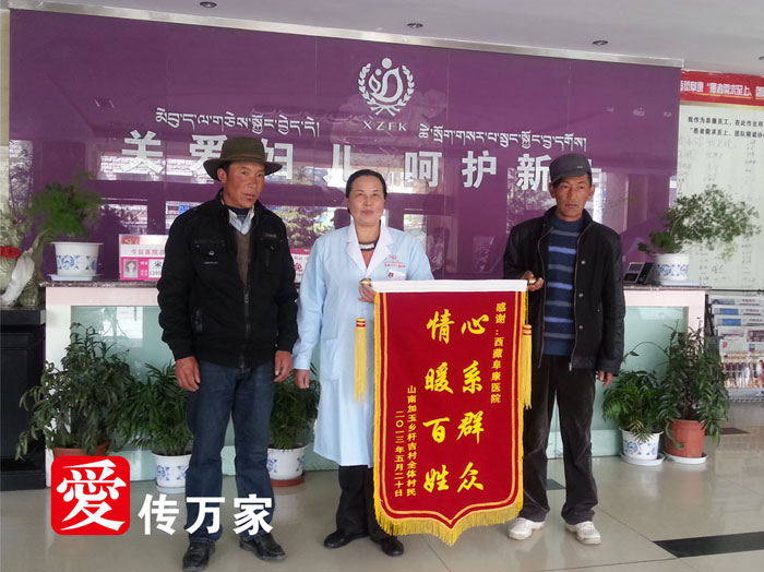 2013年5月22日阜康婦產(chǎn)兒童醫(yī)院門診大廳,山南加玉鄉(xiāng)桿吉村的塔杰書記激動(dòng)地握著呂果梅院長的手,不停地說著感謝的話,他的身邊站著桿吉村的扎西村長,村長手上拿著一面錦旗,錦旗上面寫著“心系群眾 情暖百姓”。