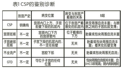 CSP患者全部都有明確的剖宮產史,胎囊著床在剖宮產瘢痕內,周圍有豐富的血流,瘢痕處肌壁變薄。在臨床工作中,CSP易與宮頸妊娠、子宮峽部妊娠、不全流產和滋養(yǎng)細胞疾病相混淆,需要仔細鑒別。一般通過病史、妊娠囊位置和B超檢查鑒別必要時可行血清βHCG、肺CT和病理檢查。