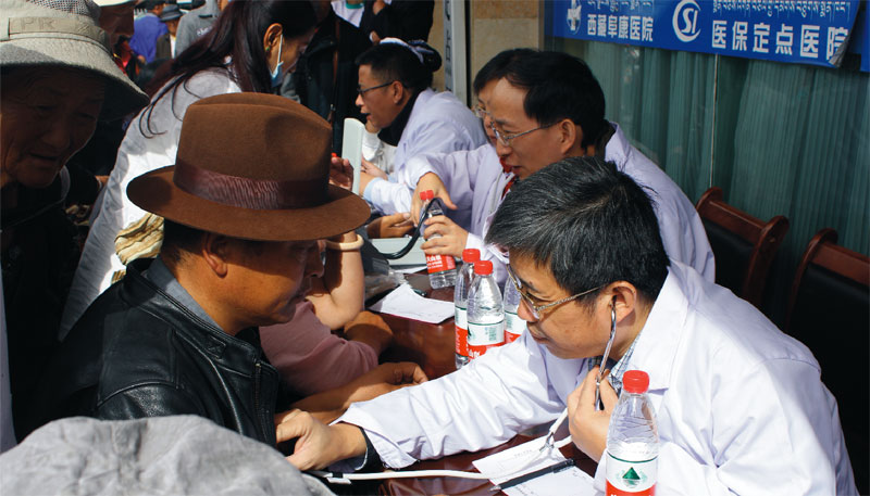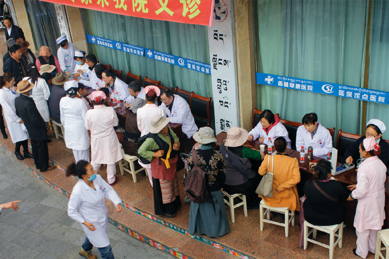 2014年9月29日,8位來自內地各大醫(yī)院的專家在娘熱路阜康醫(yī)院門口為市民義診。阜康醫(yī)院業(yè)務副院長張治說:“原本有14位專家來參加義診,可是因為幾位有高原反應,最后只有這8位老師來到現(xiàn)場。”