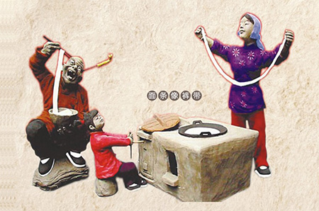 這做面條的功夫在那揉面的一關(guān),沒有揉到的面,見了開水馬上就成了塊狀,再經(jīng)水一煮,出來就是稀糊糊了。所以,這個(gè)面條的長短也是能看出這個(gè)媳婦的手藝和心計(jì)的,這也是陜西面條長的一個(gè)原因。 每到中午吃飯時(shí)間,村子里的男人都端了個(gè)大碗出來,聚在一起,用筷子挑,香香的吸,然后大家一起評說誰家的媳婦手藝好,被夸的男人總是謙虛的說:“這算個(gè)啥嘛!”其實(shí)心里像蜜樣甜,而落了下風(fēng)的男人回家少不了罵那懶婆娘幾句。關(guān)中面條以武功、楊凌、乾縣、扶風(fēng)、岐山為最好,由于當(dāng)?shù)厥炒揍勗飒?dú)特,先后有了武功縣的長寧醋和岐山醋比較有名,因此面里放醋必不可少,所謂“酸面咸攪團(tuán)”。