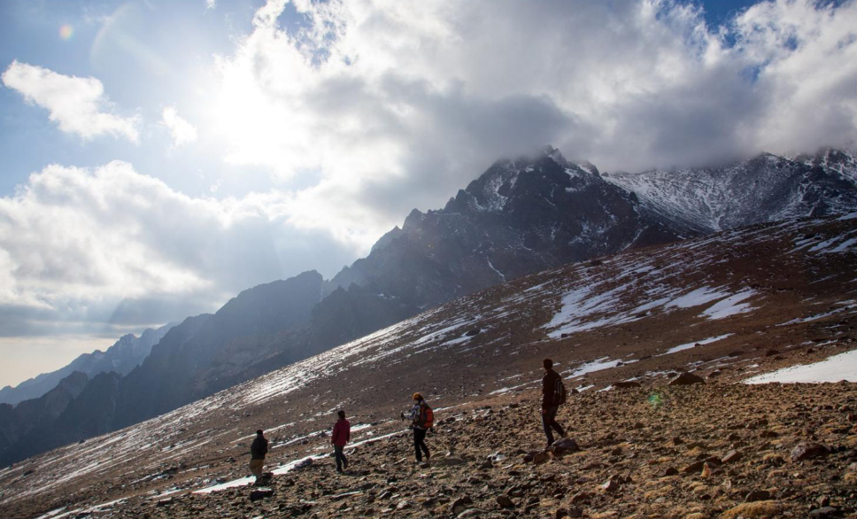 走到一個高崖的時候,C終于支撐不住停了下來,說是發(fā)燒了,我摸摸他的額頭,果然有些滾燙炙手,當下慌亂起來,不知該作何措施,只得用頭巾稍微把他的頭發(fā)盡量擦干些,大哥也給他服下了什么含片,才見到一絲好轉(zhuǎn)。還好,我這個人越在艱苦惡劣的環(huán)境,身體越是堅不可摧,這至少不會給他心里再帶去什么負擔。大概十分鐘后,我們又接著出發(fā)了,而且沒多久便見到了今天要過的第一座橋。