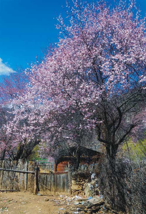 桃花溝對于外人只當(dāng)闖入了陶淵明筆下的“桃花源”,而對于波密人,這只是一個普通的村落。這些桃樹都是野生的,有的上百年,甚至上千年,一個人抱的樹是最常見的,兩三人合抱的也屢見不鮮。這些野桃樹不只是大而且多,田間、屋后、路邊、山中隨處能見到三三兩兩挺立著。最多的是在山坡上,常常是漫山遍野,呼拉拉總有成千上萬的感覺?;ㄉm柔美,卻從骨子里透出高原的雄渾和雪域驕傲的氣勢,藍(lán)天之下,碧水之畔,妖嬈多姿。每年三月中旬至四月初,漫山遍野的桃花開始鋪滿山坡,綿延至河谷。大株的桃花樹如同桃花仙子,偎依在雪山之下,與云朵相擁,形成密集的桃林。漫步其中,可見雪峰聳立,桃花怒放,清泉嬉戲,藏寨悠然,美到令人窒息。