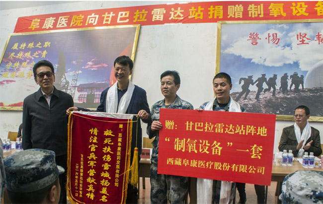 2016年5月11日,西藏阜康醫(yī)院有限公司向甘巴拉雷達(dá)站捐贈制氧設(shè)備儀式在甘巴拉雷達(dá)站營地舉行,西藏自治區(qū)政協(xié)副主席、區(qū)工商聯(lián)主席、區(qū)總商會會長阿沛·晉源,區(qū)工商聯(lián)副主席劉洪,區(qū)工商聯(lián)政研室主任張?jiān)茖殻瑓^(qū)工商聯(lián)經(jīng)聯(lián)處副處長秦林,95662部隊(duì)政治委員楊壽保,甘巴拉雷達(dá)站政治教導(dǎo)員李再華,西藏阜康醫(yī)療股份有限公司黨委書記、董事長王斌,黨委副書記、總院長張德才,黨委紀(jì)檢委員、總經(jīng)理陳彬以及甘巴拉雷達(dá)站全體官兵等出席了本次捐贈儀式。