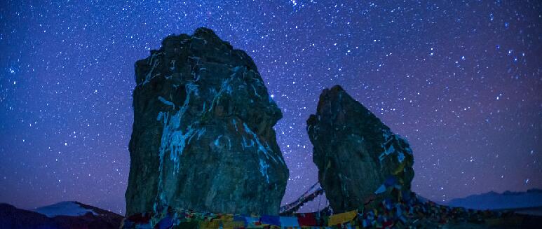 待得夕陽落盡,繁星滿天,九垓汗漫,玉宇無塵,皓月灑下一天一地的清輝,照得湖面靜沉沉如一塊青碧琉璃。天上桂魄流光,地下瑩玉幻彩,上下爭輝之際,人處其中,如置身于晶宮鮫室,亦幻亦真,似臨仙境。納木錯是藏密圣地,緣湖一帶似也受到佛法洗禮,便如禪那洞天,菩提妙境。佛學(xué)無法無相,漫無涯涘,水之為物,也是隨圓就方,緣物賦形,納木錯正契合佛法妙諦。
