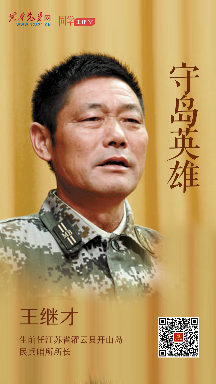 王繼才(1960—2018),江蘇灌云人。2003年10月加入中國共產(chǎn)黨。江蘇省灌云縣開山島民兵哨所原所長、開山島村黨支部原書記。自1986年起,毅然擔(dān)起守衛(wèi)黃海前哨開山島的重任。他和妻子以海島為家、與艱苦為伴,堅持每天升起國旗,每天按時巡島,護航標(biāo)、寫日志,與走私、偷渡等不法分子作斗爭。2018年7月27日,在執(zhí)勤期間突發(fā)疾病,經(jīng)搶救無效不幸去世。王繼才夫婦被評為全國“時代楷模”,王繼才后被追授為“全國優(yōu)秀共產(chǎn)黨員”。
